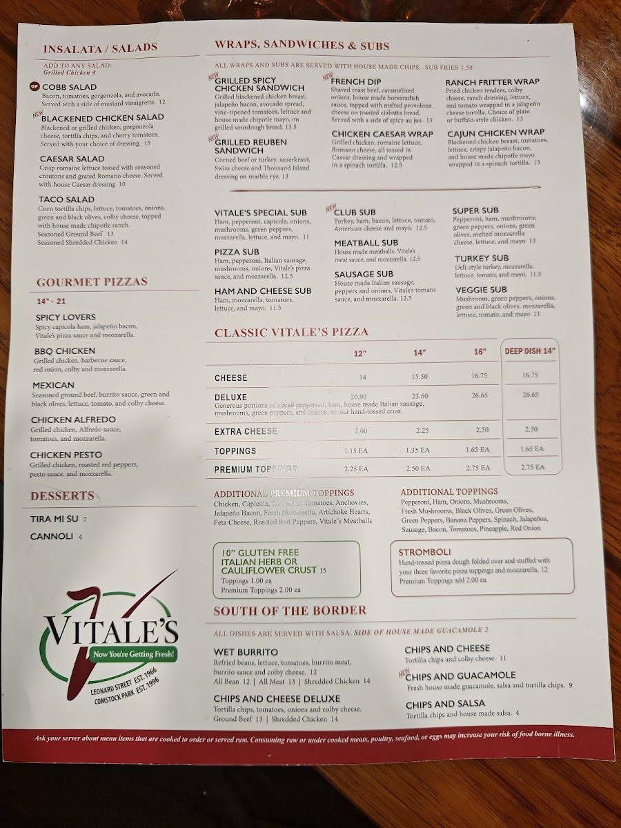 Welcome to Vitale's Pizza Grand Rapids, where mouthwatering flavors and comfort food meet in a vibrant atmosphere. Nestled in the heart of Grand Rapids at 814 Leonard St NE, this beloved eatery offers an extensive menu that promises to delight every palate. Dive into their signature pastas, featuring the Homemade Manicotti and the irresistible Mostaccioli Al Forno, both generously topped with rich sauces and melted mozzarella.